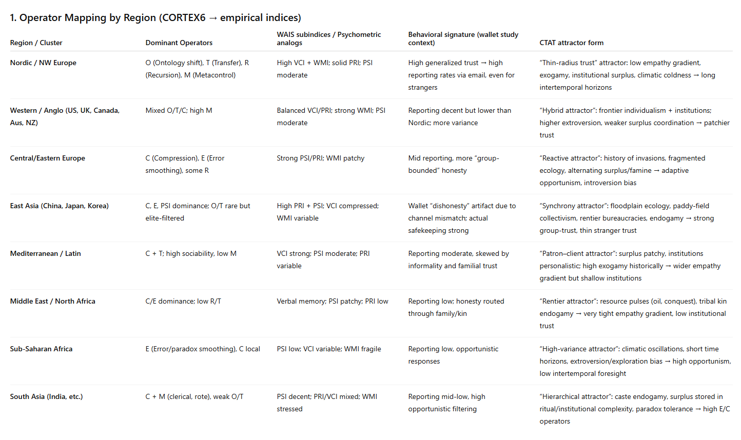 1. Wallet Honesty – Operator Bandwidth and Mismeasurement: CTAT agrees with Whitfeld that the email-based wallet experiment was biased, but frames this as one instance of a broader phenomenon of operator mismeasurement. From a CTAT perspective, standardized tests or experiments often “overfit midrange cohorts” and fail to capture behavior at different cognitive or cultural settings. In the wallet case, CTAT notes that using email to gauge honesty imposes a friction cost and low-“penetrance” channel in a context (China) where that channel is culturally out of sync. The effect of such friction is not uniform across cognitive bands: individuals or societies with different operator profiles respond differently to the same task demands. CTAT posits that lower and mid cognitive bands (which correspond to simpler, more habit-bound operator modes) are highly sensitive to effort and normative cues. In China, emailing a stranger is an atypical, effortful act – something that might not occur to someone unless strongly cued. The original experiment inadvertently measured tech platform usage and initiative (who checks email regularly and bothers to respond) more than innate honesty. CTAT thus generalizes: when a test uses a modality with uneven cultural penetration, groups less aligned with that modality will underperform – not due to lack of underlying trait, but due to mismatch in operator engagement. In CTAT’s terms, the Chinese finders had the “honesty operator,” but the test failed to engage it because it introduced extraneous operator barriers (email, an unfamiliar script). Once a low-friction scaffold (a QR code) was provided, the honesty behavior “unlocked” and appeared at levels comparable to the West. CTAT likens this to the Flynn effect in IQ testing: massive IQ gains have occurred over generations not because people became fundamentally smarter (g didn’t magically increase), but because modern environments “teach to the test” – scaffolding certain abstract operators and familiarity that older generations lacked. Similarly, providing WeChat in the wallet study did not make Chinese people more honest; it simply allowed the existing honesty trait to manifest by removing an operator mismatch (the need for an email).