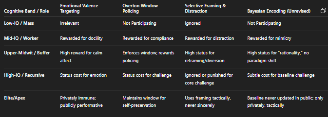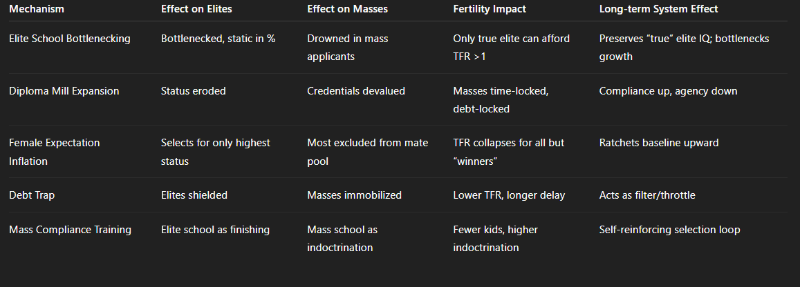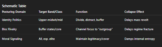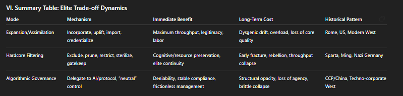 Elites must always choose between expanding the productive base (which accelerates decline) and hard filtering (which risks revolt and system fracture). No timing or blend can rescue the pyramid from its own feedbacks.Algorithmic and Symbolic Management are Late-Stage Filters: